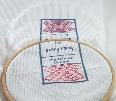 The quote reads "Nothing is hopeless, we must hope for everything." It's just cut off by the embroidery hoop :P And it's by Madeleine L'Engle. I'm getting close on this one! Which is good - cuz it's a present :P Well that, and the next project is for ME and I want to start on it.